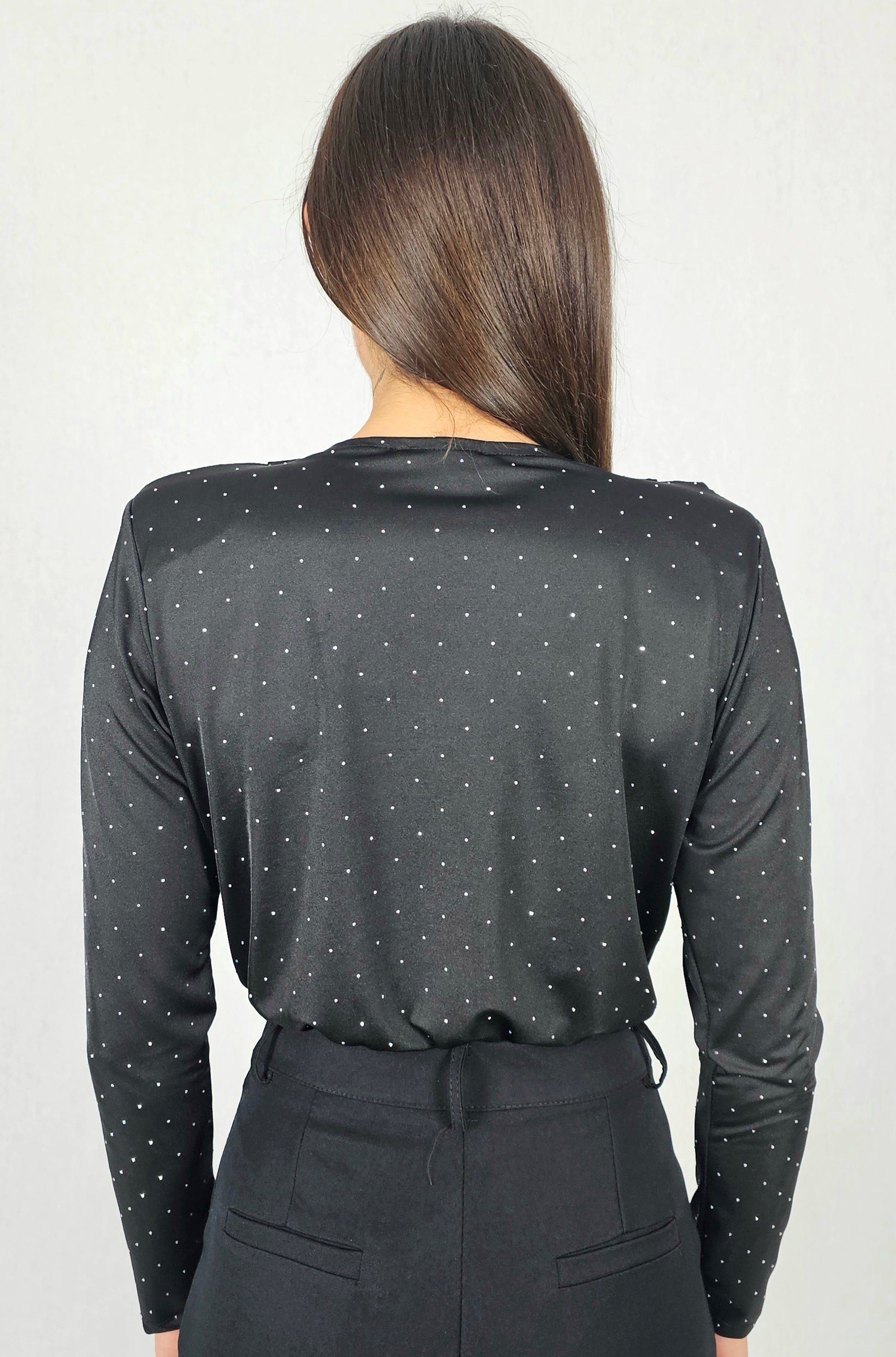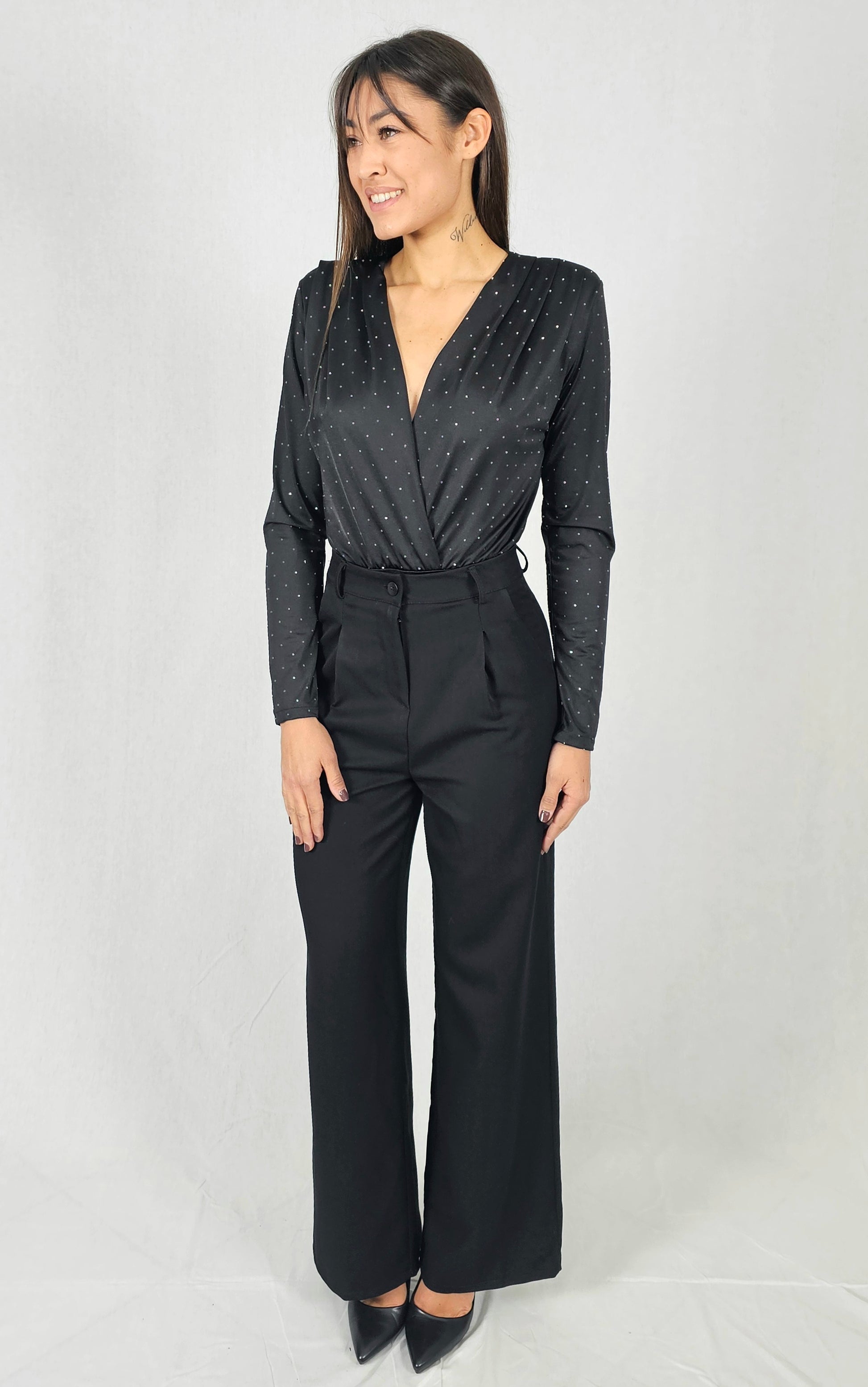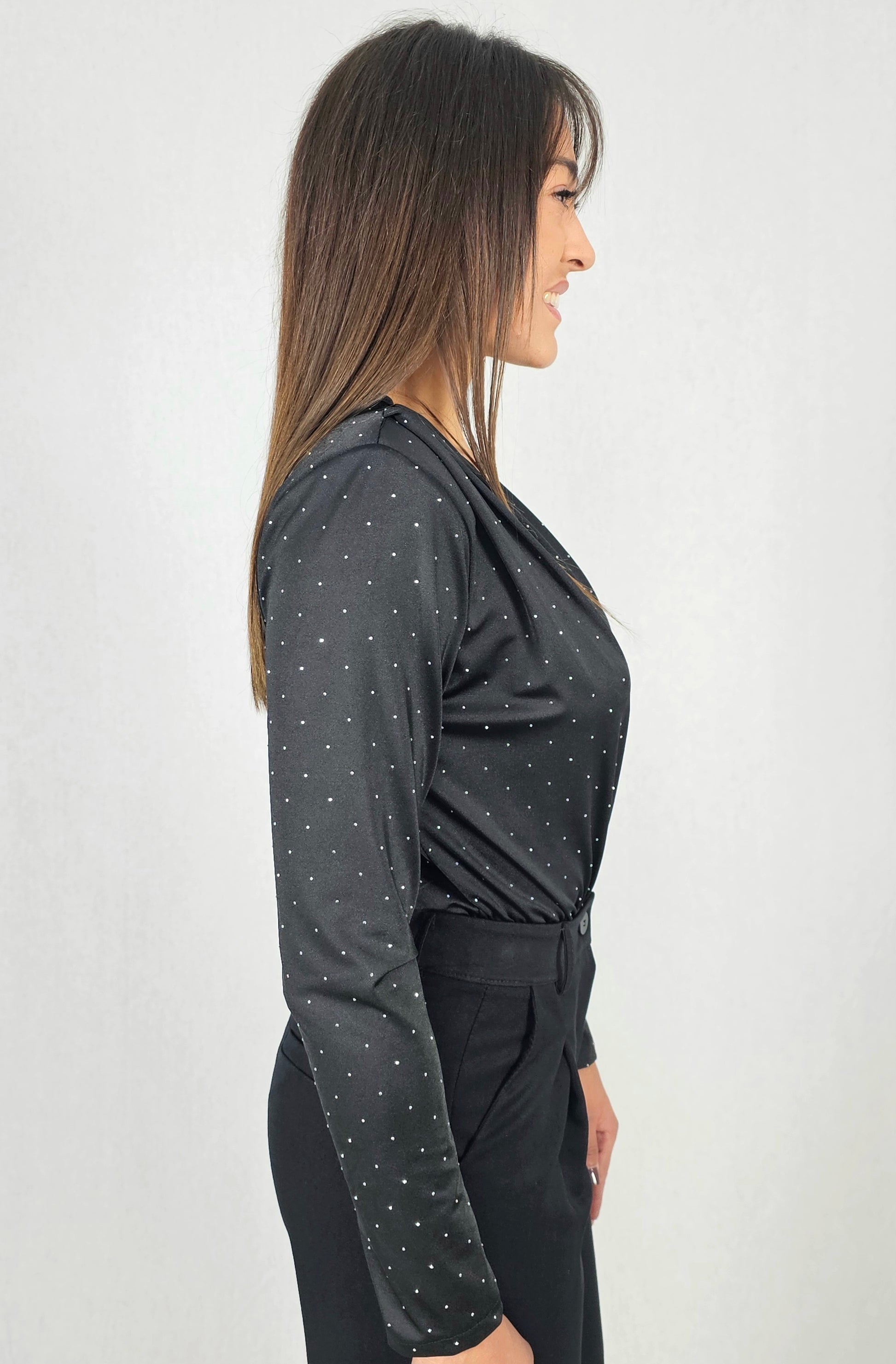 Ce body noir à strass est la pièce incontournable pour un style sophistiqué et glamour. Avec son décolleté croisé et ses détails scintillants, il sublime la silhouette tout en restant confortable.