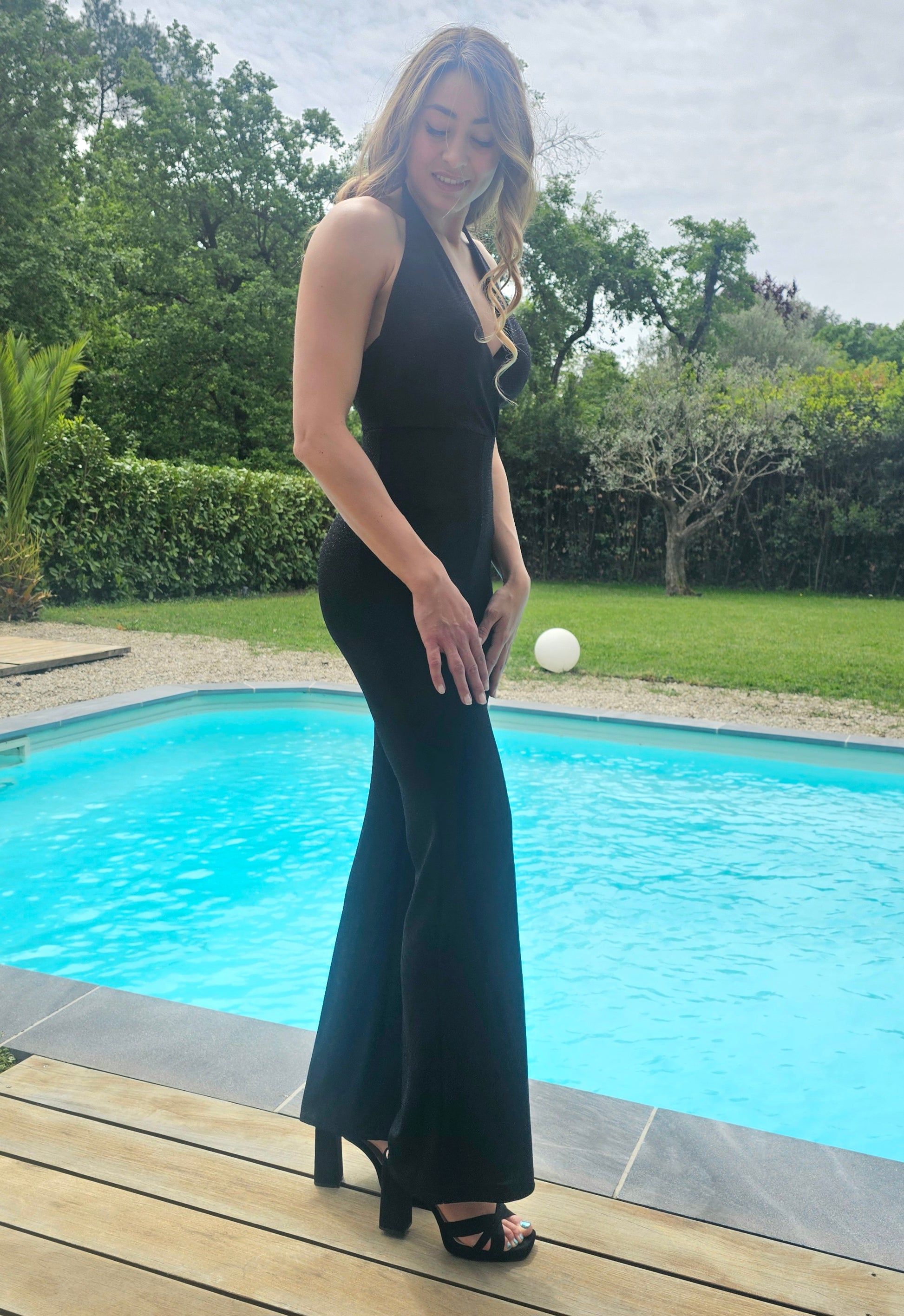 Combi-pantalon à paillettes dos nu. Cette tenue est idéale pour vos soirées, offrant une matière agréable et légère qui convient parfaitement à la chaleur, agrémentée de paillettes. Son style convient avec des escarpins.
