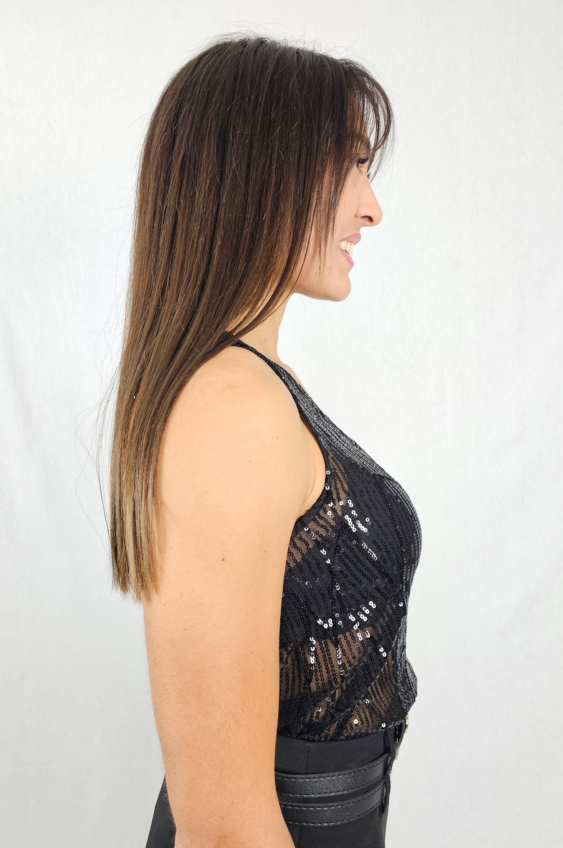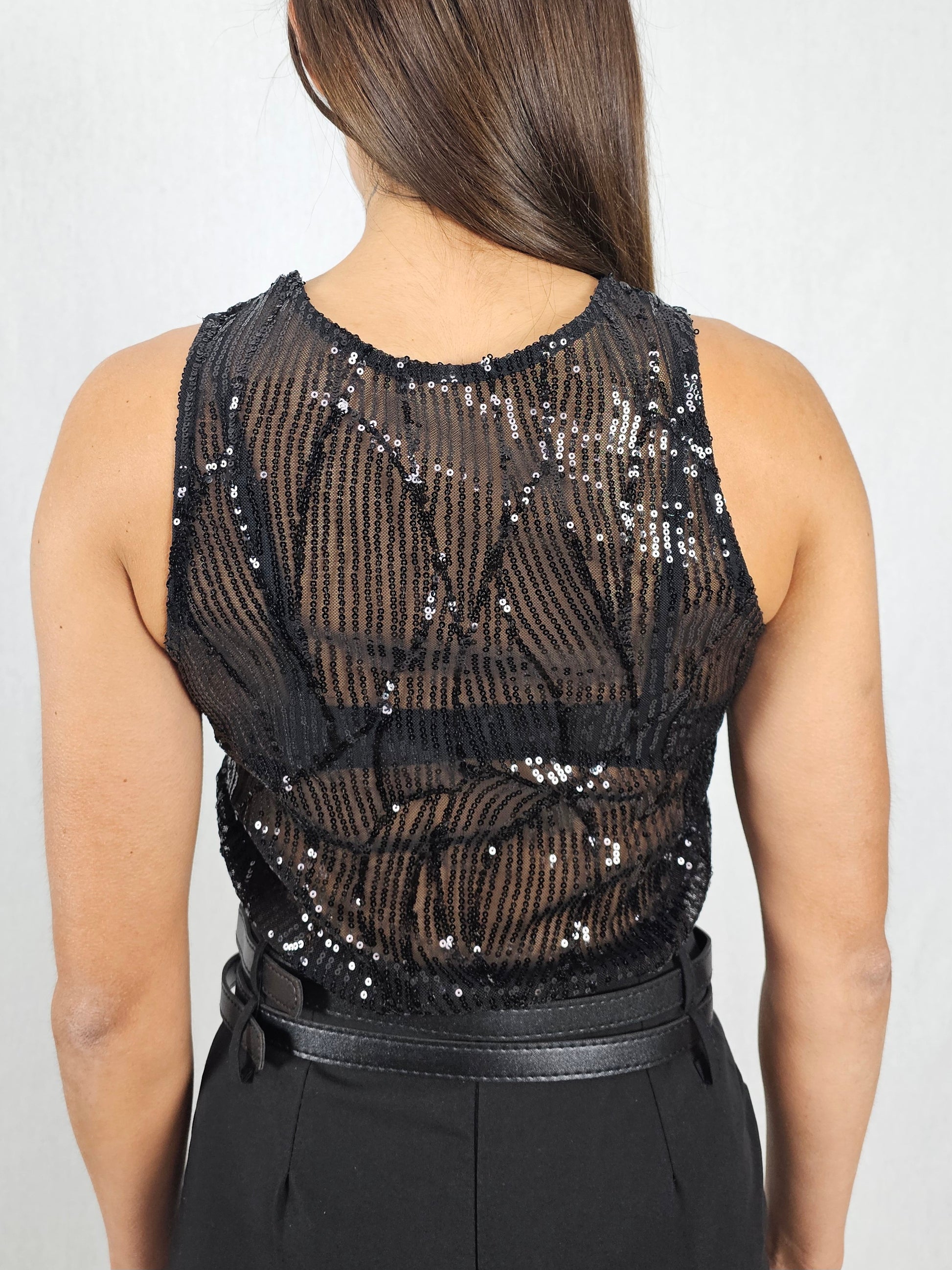 Ce haut noir en sequins est un véritable atout pour un style audacieux et élégant. Avec son design semi-transparent et ses détails brillants, il est idéal pour des soirées ou des occasions spéciales.