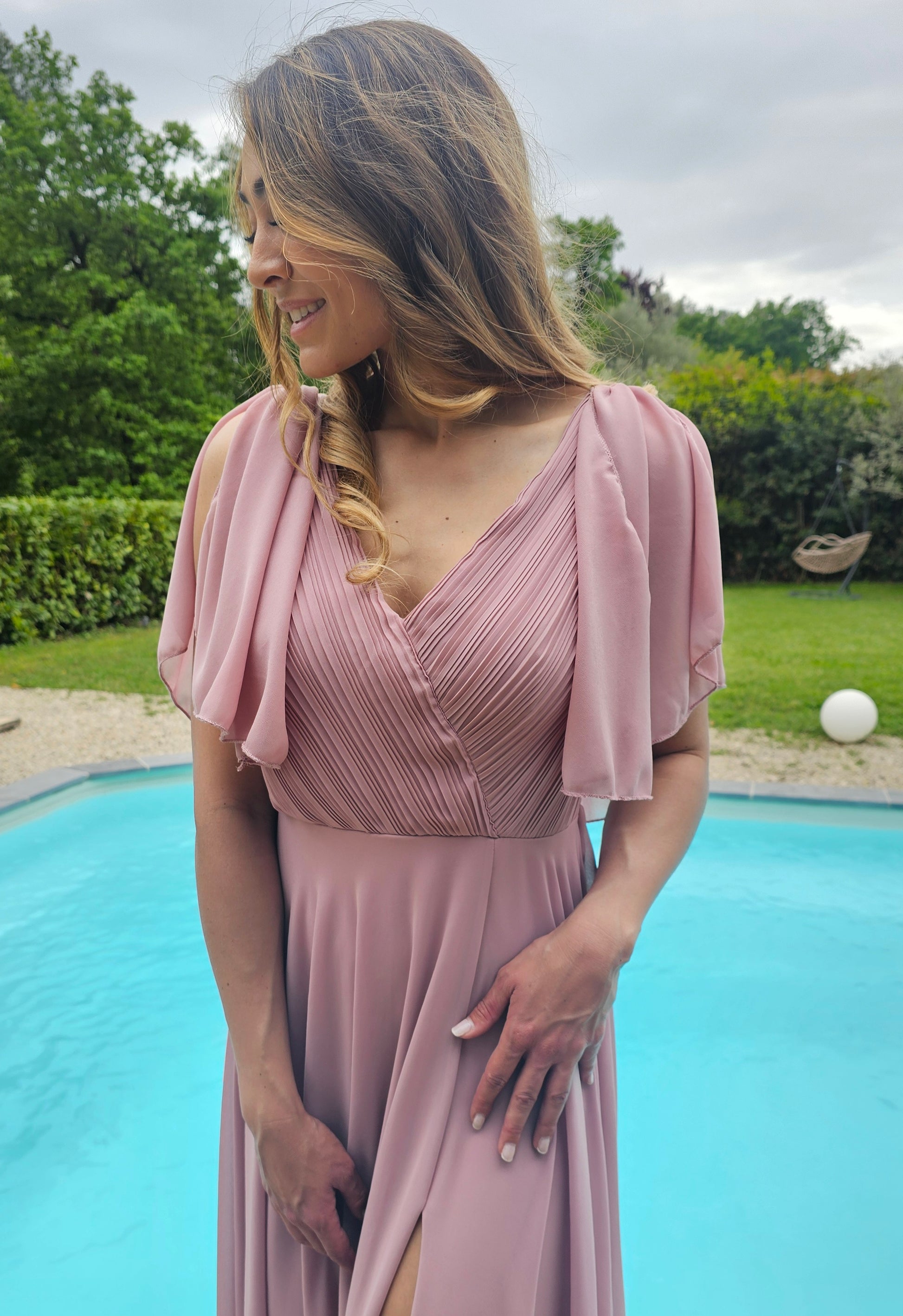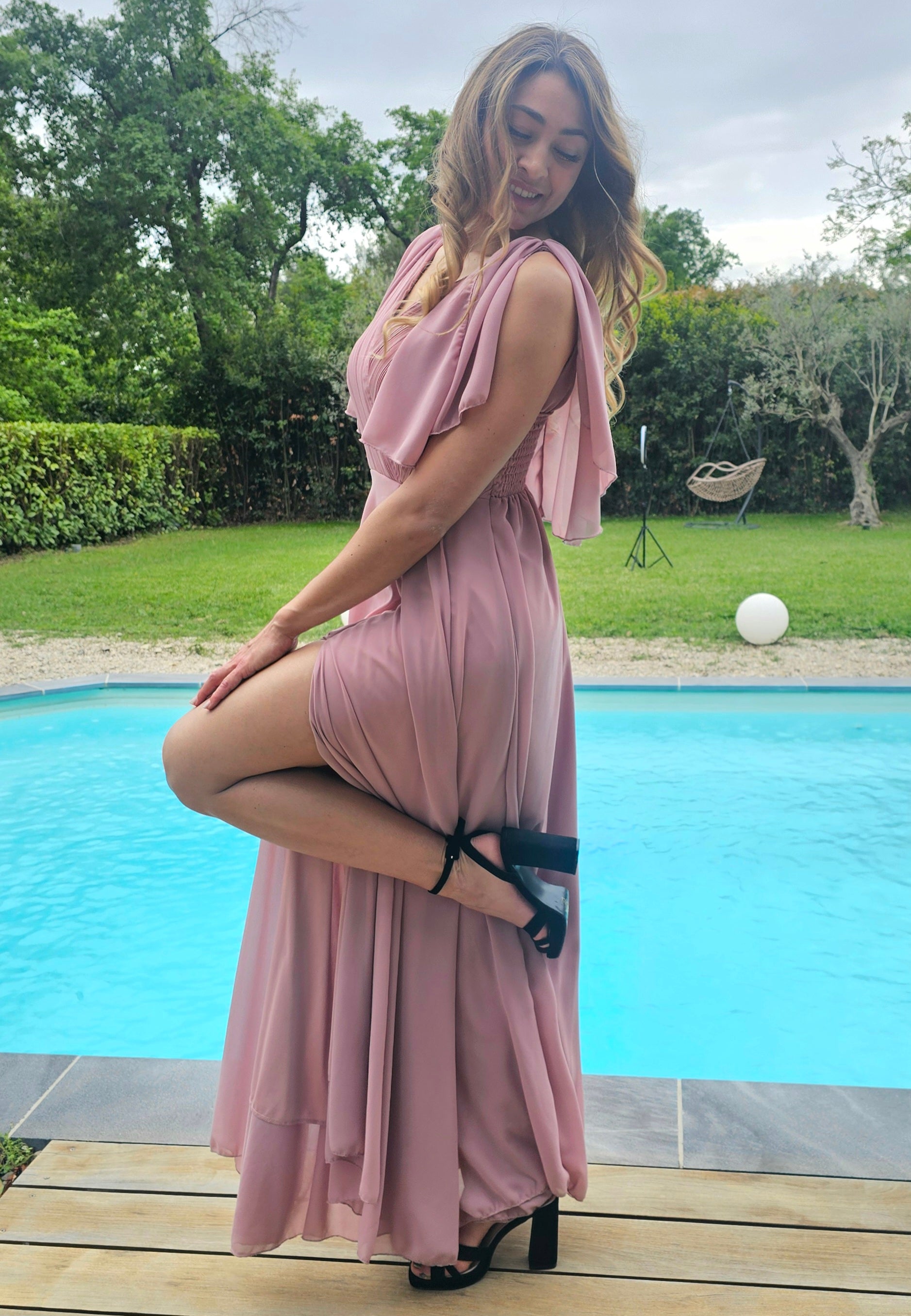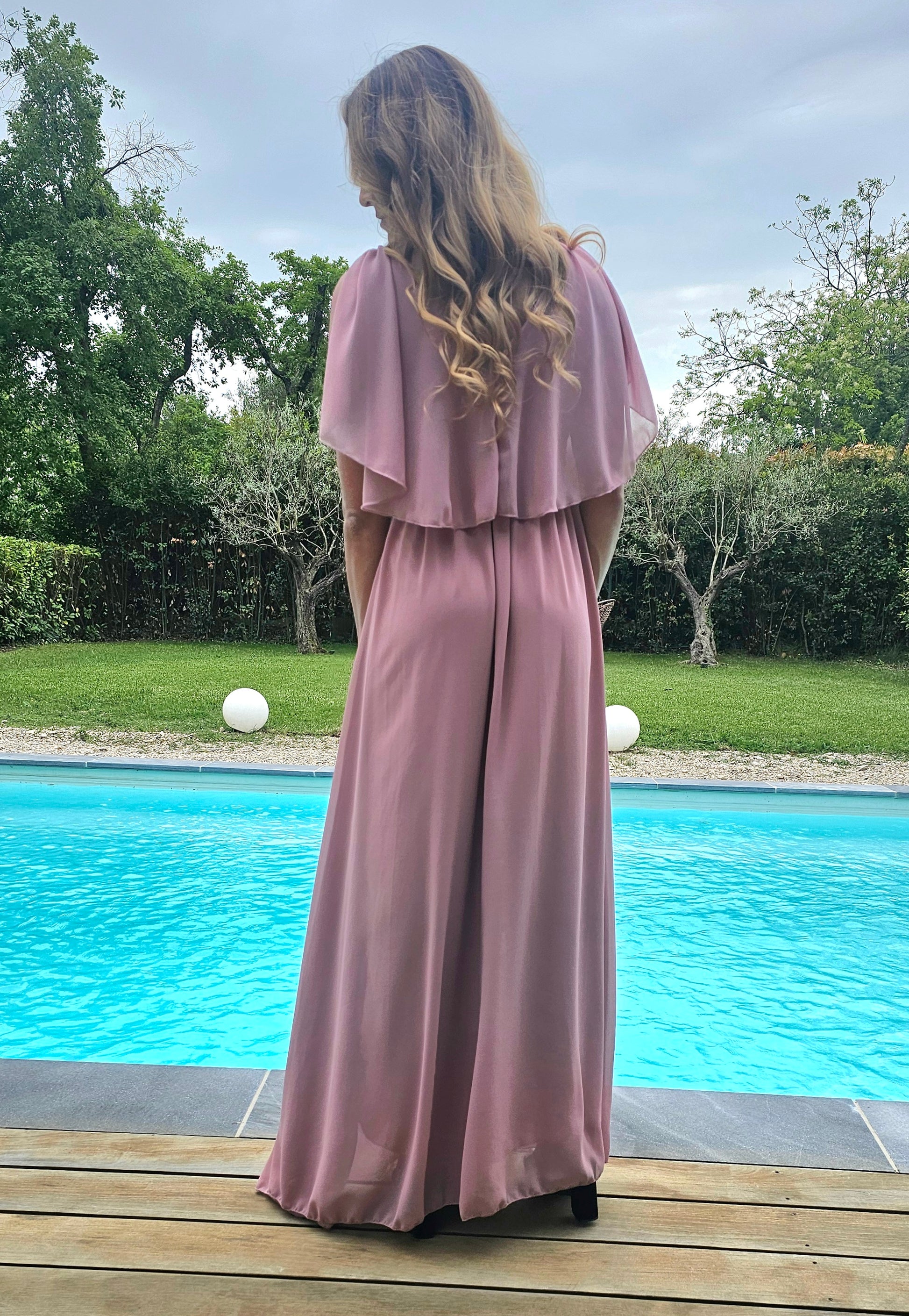 Robe longue et légère, avec une mini-cape couvrant les épaules, munie d'une fente sur le côté gauche. Cette robe est l'alliée parfaite pour une cérémonie ou une soirée cocktail.Fabriquée dans un tissu léger et agréable,elle offre un confort optimal.Son style se marie harmonieusement avec des escarpins pour un côté chic et élégant.