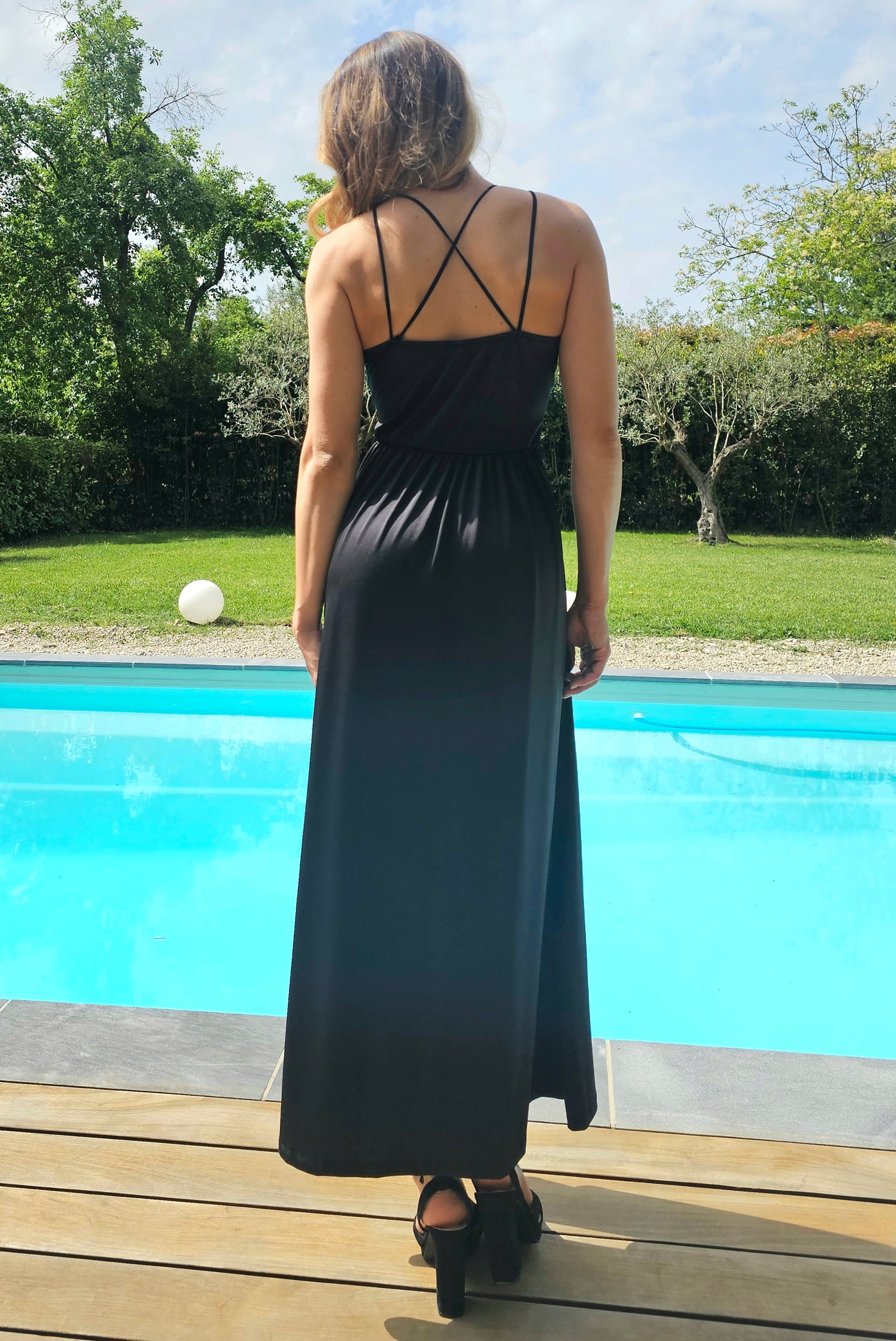 Robe longue et légère, avec des bretelles fines croisées dans le dos, munie d'une fente sur le côté gauche. Cette robe est l'alliée parfaite de vos soirées estivales. Fabriquée dans un tissu léger et agréable, elle offre un confort optimal lors des soirées d'été. Son style se marie harmonieusement avec des escarpins pour une touche élégante.