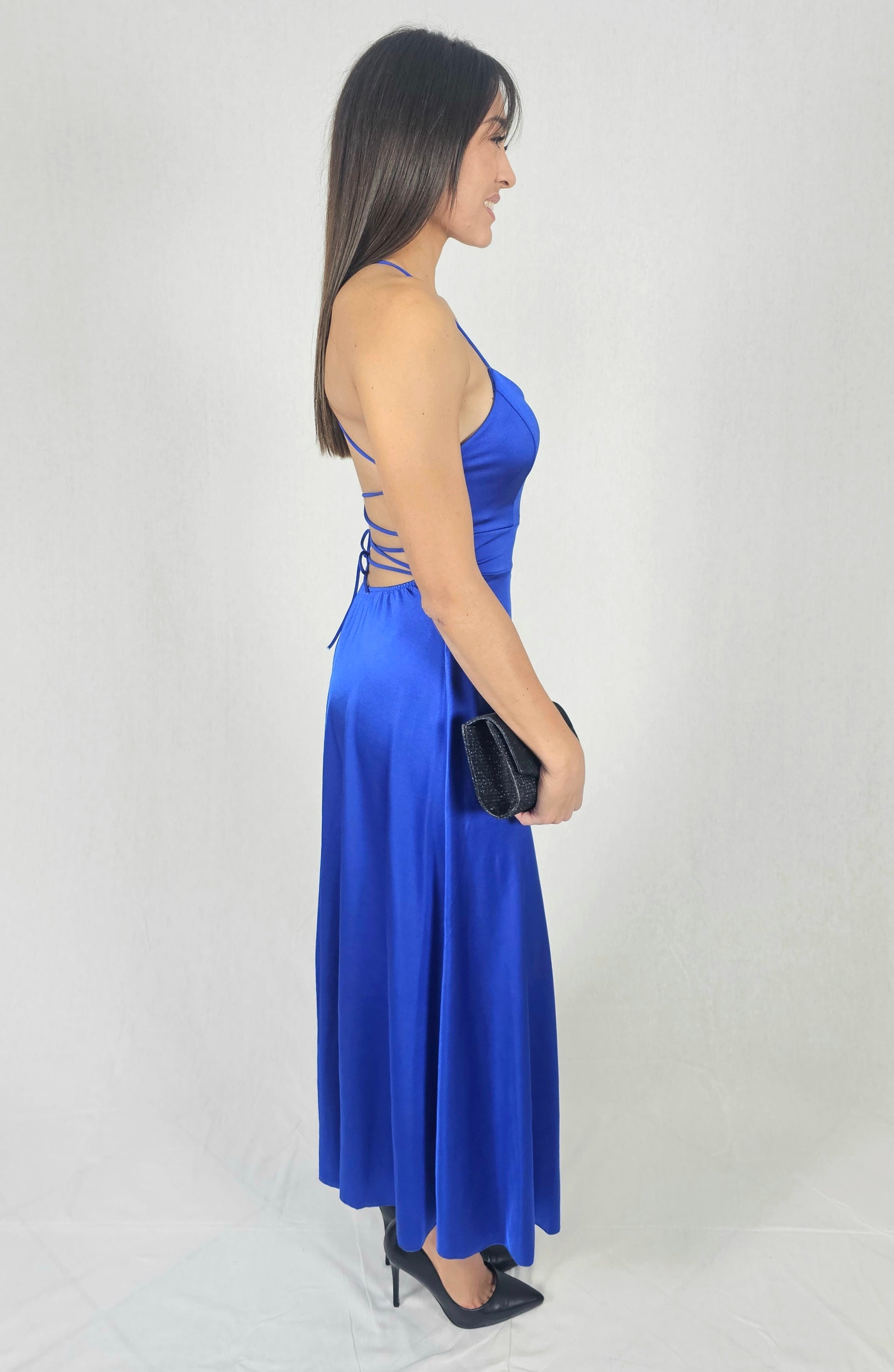 Robe évasé, avec un joli dos nu ornés de fils croisés, fente côté gauche et coque intégré. Cette tenue est idéale pour des événements. Associez-la avec une petite pochette et une jolie paire d'escarpins pour un look élégant.