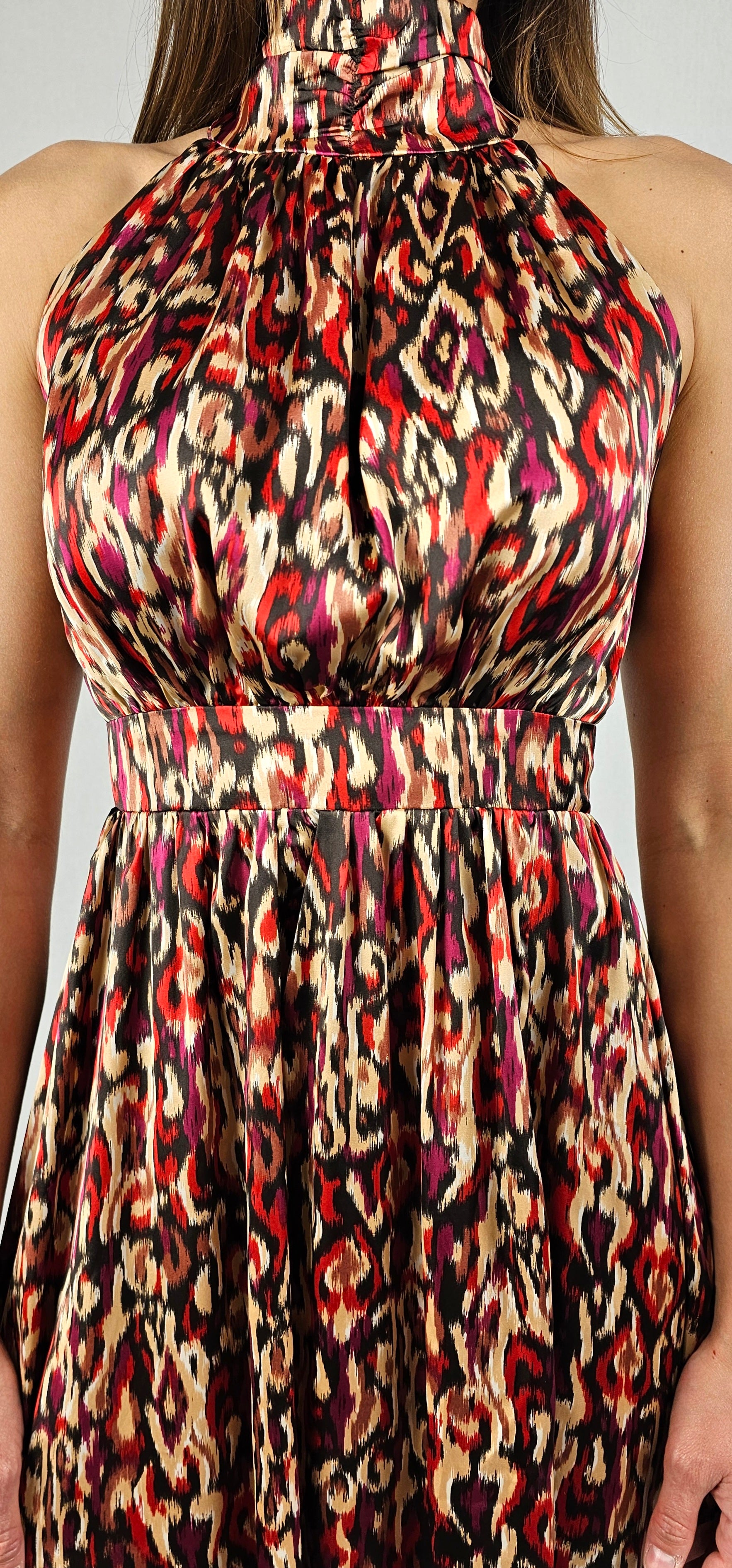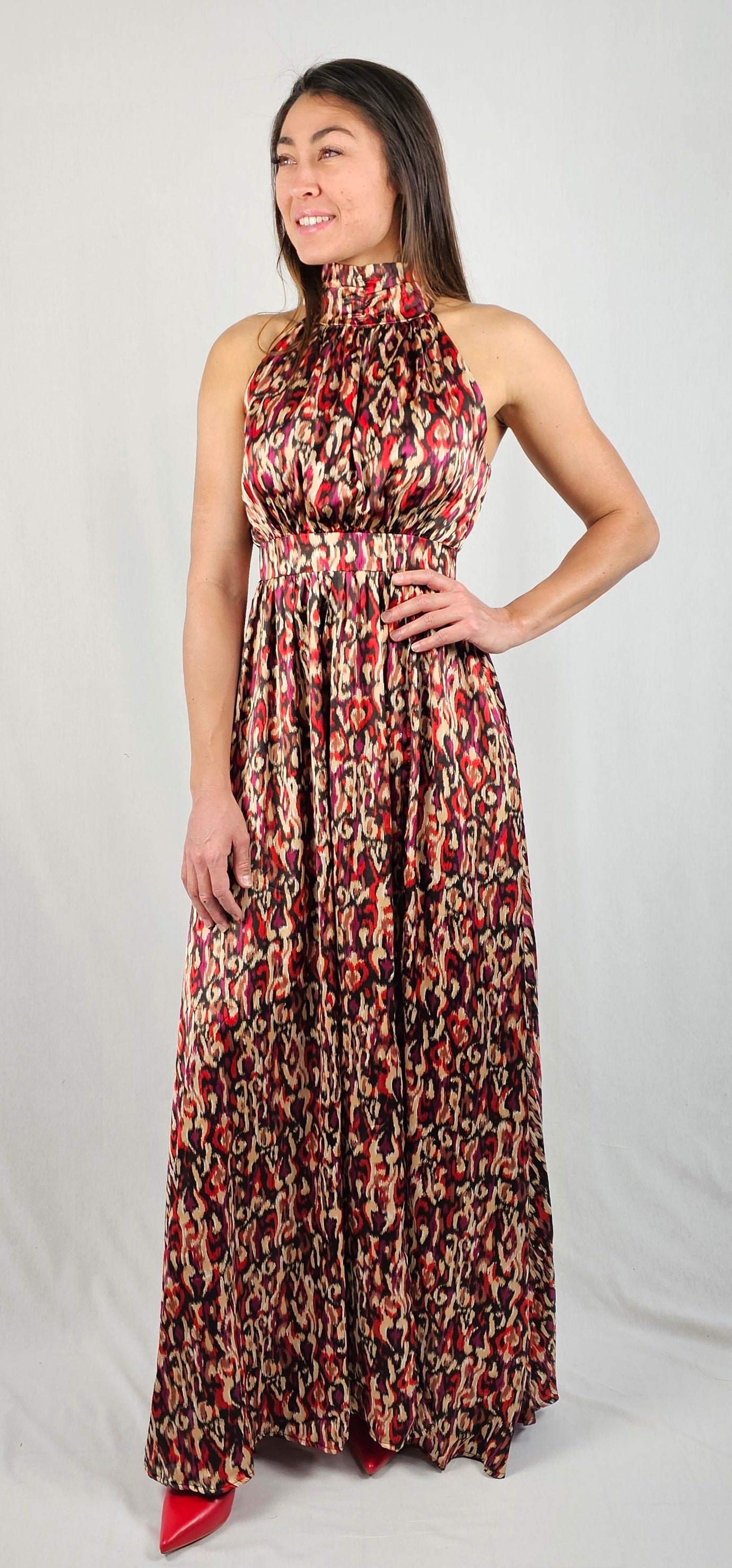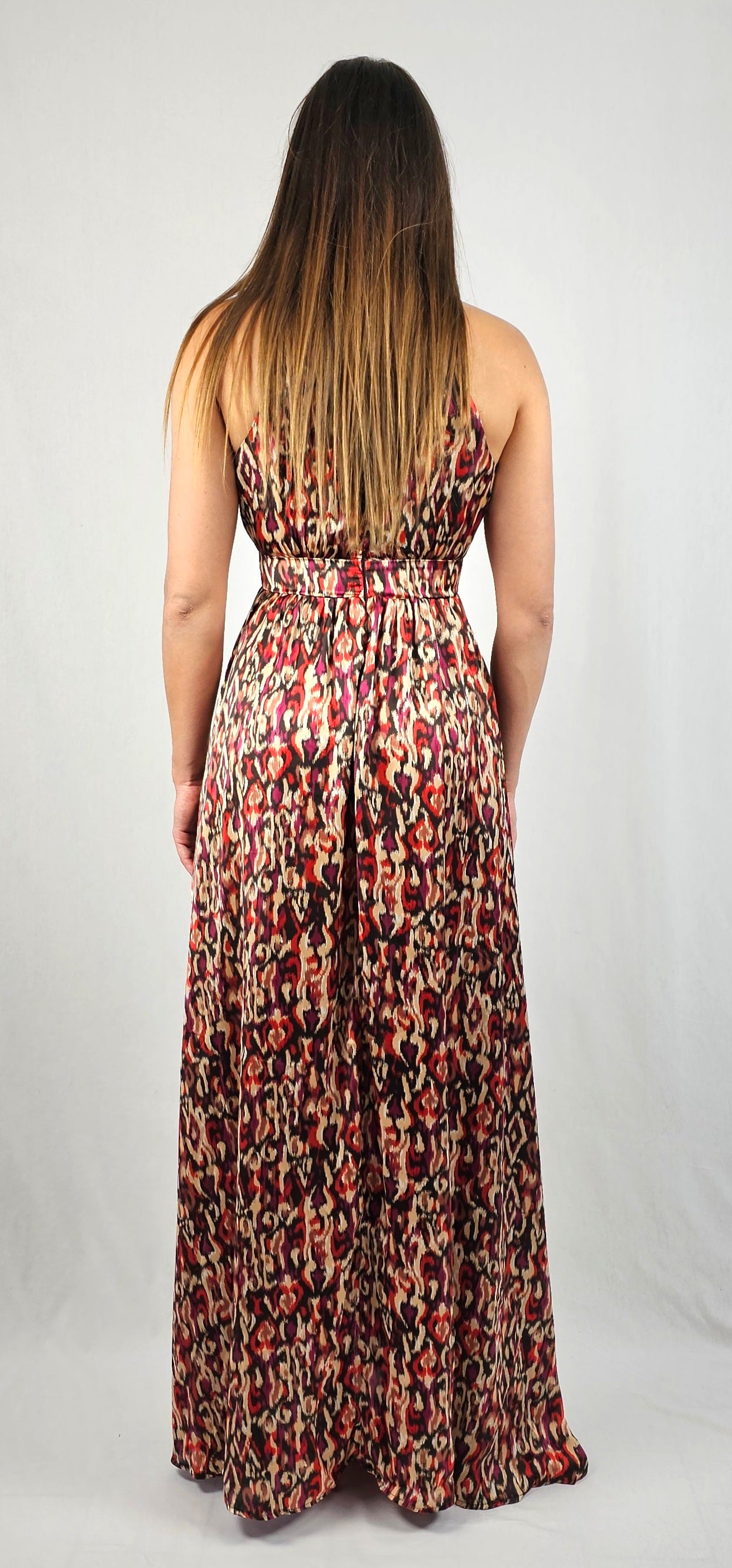 Robe longue en satin sans manches à col vertical multicolore. Cette tenue offrant un tissu agréable et léger convient parfaitement à la chaleur. Son style se marie harmonieusement avec des sandales Tropéziennes.