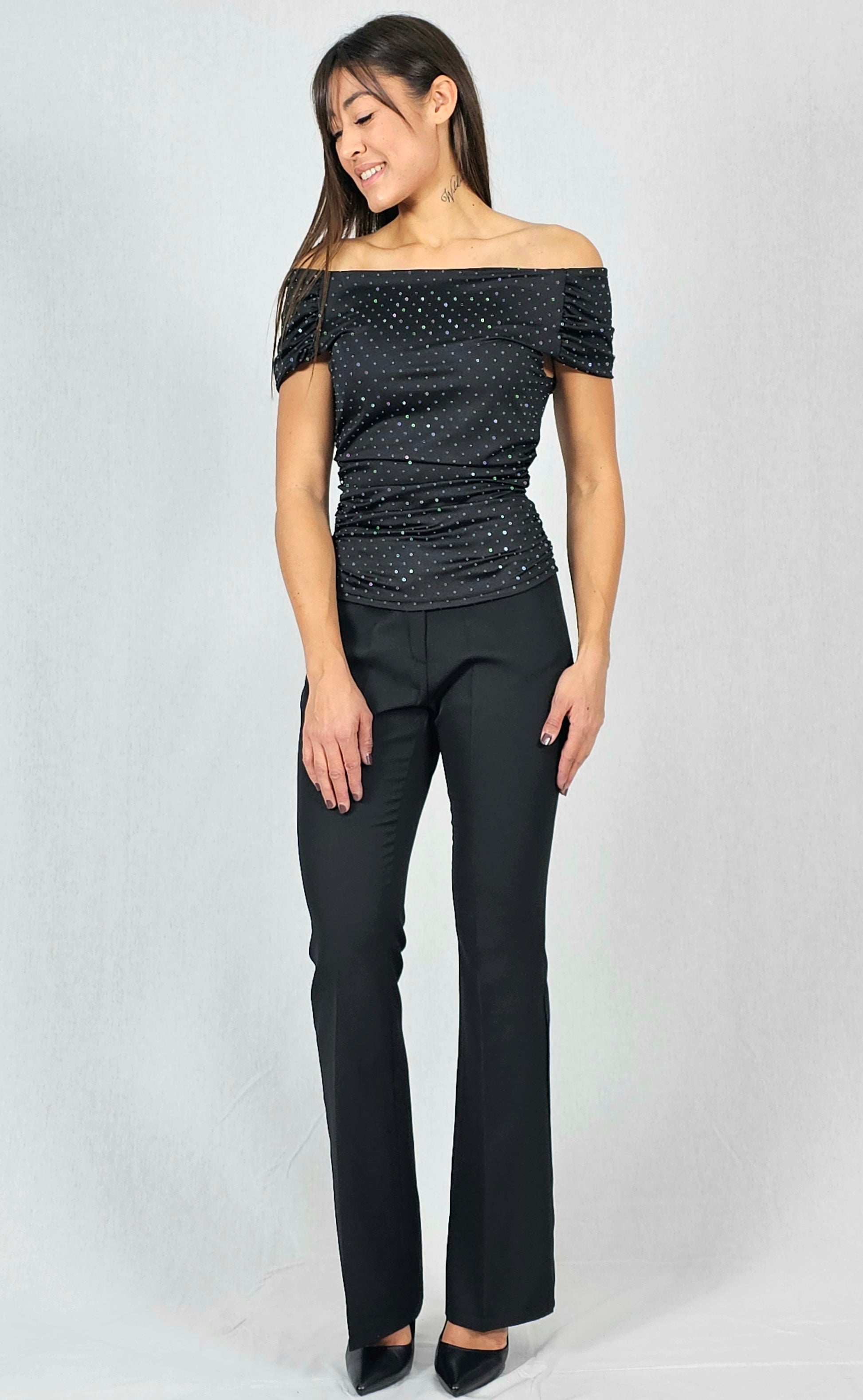 Ce top noir à épaules dénudées et à strass est un indispensable pour un look chic et moderne. Avec sa coupe ajustée et ses détails scintillants, il s’adapte parfaitement à des styles casual ou habillés.
